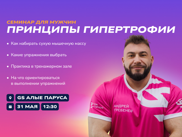 31 мая в 12:30 в фитнес-клубе GS Алые Паруса состоится семинар, посвящённый гипертрофии мышц. Мероприятие проведёт сертифицированный тренер Андрей Гребенев, опытный специалист в области силового и функционального тренинга.